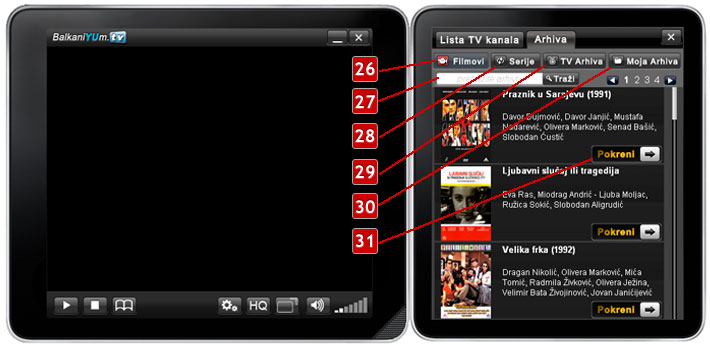 | 21 | Arhiva - Filmovi, serije, TV arhiva | 24 | Pokretanje TV programa | |